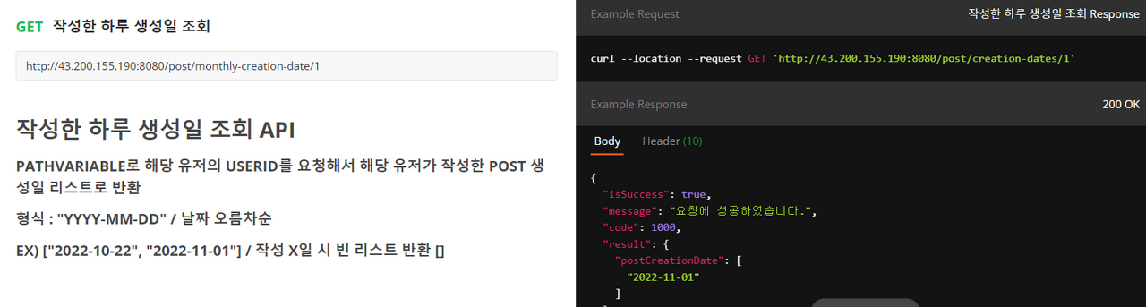 유저 아이디와 달을 구별하여 서버에 요청을 보내고 postId와 작성한 날짜를 바디 데이터로 받는다.