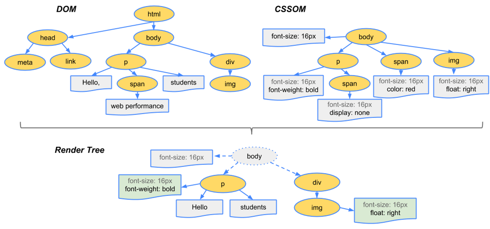 - DOM Tree → CSSOM Tree ⇒ RenderTree