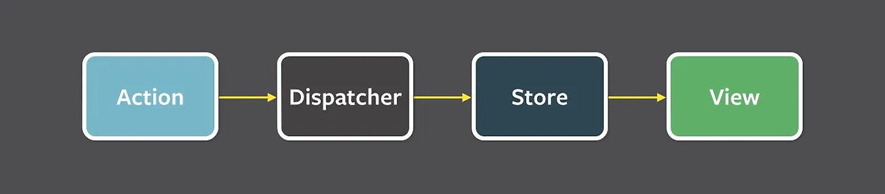 Action이 발생하면, Dispatcher에서 이를 해석한 후 Store에 저장된 정보를 갱신하고, 그 결과가 다시 View로 전달된다.
